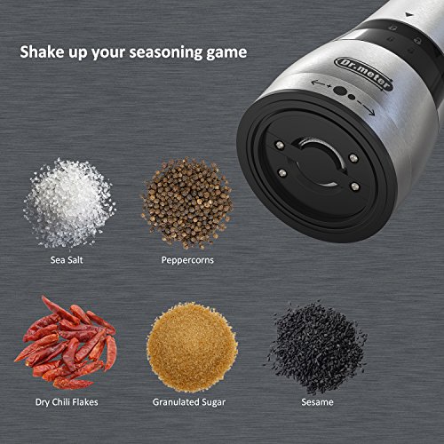Dr.meter pepper mill is excellent for extensive grinding to create your very own fresh seasonings, ingredients and spices. Dispense freshly grinded peppercorns, sea salt and even sesame though the premium ceramic rotor that doubles up as a kitchen seasoning pot. Dressed in classy stainless steel, it is rust-proof, prevents water accumulation in the mill to keep the ingredients at top-notch quality, and is ready to amp up your food game with freshly grinded spices. Features -?Gift box packaging. Includes 2 grinders?which can be used for grinding of salt, pepper, peppercorn, sea salt, Himalayan Salt, cloves and other spices -?Precision mechanism?of salt and pepper shakers allows for adjustment of any grinding setting from fine to coarse - Made out of?food-grade materials, primarily highest quality stainless steel and BPA free acrylic - Table enhancement. With its clear body and brushed stainless steel grinder mill, this salt and pepper shaker is sure to add its elegant touch to your table. Specifications - Width: 2.56" (6.5 cm) - Height: 8.46" (21.5 cm) - Capacity: 5.3 oz /150g Package Contents 2 x Pepper Mill 1 x Brush 1 x User Manual 1 x Warranty Card 1 x Gift Box