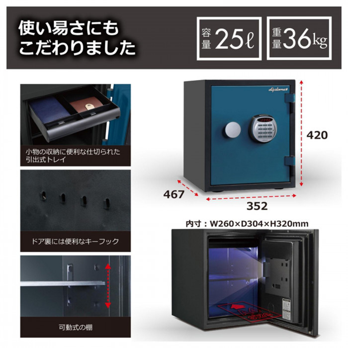 | 仕様 | 容量:25L 収納サイズ:A4(横に収納) ロック方式:R3デジタルテンキー方式 使用電池:単三電池4本 |