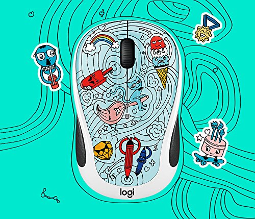 -. Feature : A Logitech Doodle Collection M325c Wireless Mouse takes you far away from the everyday / All the way to your happy place / Choose from doodle designs that reflect your creativity / Lasts up to 18 months on a single battery / Responds up to 33 ft