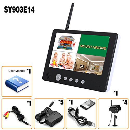 -. Binding : Electronics -. Brand : MOUNTAINONE -. EAN : 0614019410509 -. Feature : 4CH digital wireless camera and DVR system / Support up to 32GB TF card / Support 4 cameras/24hours/9 days non-stop overwrite recording / 6-15 meter night vision range / Weather proof outdoor cameras with 100M transmission open range -. Label : MOUNTAINONE -. Manufacturer : MOUNTAINONE -. MPN : SY903E14 -. PackageQuantity : 1 -. PartNumber : SY903E14 -. ProductGroup : Photography -. ProductTypeName : SURVEILANCE_SYSTEMS -. Publisher : MOUNTAINONE -. Studio : MOUNTAINONE -. Title : MOUNTAINONE 4pcs 9 inch TFT Digital 2.4G Wireless Cameras Audio Video Baby Monitors 4CH Quad DVR Security System With IR night light Cameras -. UPC : 614019410509