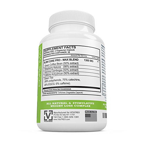 Are you looking for a fast, effective and completely safe way to lose weight and get your body ready for the summer or do you just want to slim do and live a healthier lifestyle? SLIM CORE MAX is an all-natural dietary weight loss supplement made with the simple goal of suppressing hunger and helping you burn fat away for a slimmer and sleeker body without any negative side effects. We used only 100% Natural and Potent Garcinia Cambogia along with Raspberry Ketone that is highly regarded and scientifically proven to aid in the weight loss process. This weight loss supplement helps you burn the fat away while helping you suppress your appetite without you feeling hungry or low on energy. Using our unique blend of Garcinia Cambogia, Raspberry Ketone, Green Tea, Caffeine Anhydrous and Green Coffee Bean Extract, this weight loss supplement for women and men slows down your fat production, suppress your appetite and provide a boost of energy along with focus much like coffee just with the jitters. All ingredients are 100% Natural and free from any kind of GMOs, preservatives, artificial ingredients, gluten, or any other fillers to deliver a potent and completely safe dietary supplement that will help you slim down and get back in shape! The effectiveness of each ingredient is backed by scientific facts and research which is why we can offer a 100% Results or Refund MONEY BACK GUARANTEE. VitaTREX has been a leading provider of dietary and fitness supplements on the market and have consistently delivered high quality and potent supplements that helped many people accomplish their diet and fitness goals. Using the finest ingredients and the best business practices, VitaTREX is determined to bring the best of healthcare to you. Click on the "Add To Cart" button now and start your journey to gain a slimmer and healthier body today! *Feature