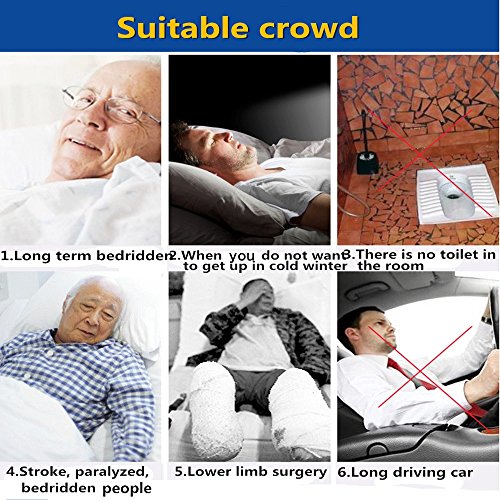 Features: The unique design of this urinal bottle makes it completely spill proof and leak proof. With handle,Can even be left in the bed, making it instantly available to the user. Easy to empty and clean using household disinfectants. Vent Holes:The urine flows into the urinal more quickly