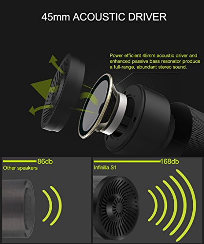 -. Feature : HIGH QUALITY CRYSTAL CLEAR SOUND: Bluetooth V4.0 chipset, powerful 45mm (3V) acoustic driver and enhanced passive bass resonator produce a full-range, abundant stereo sound and enhanced bass without distortion even at highest volume. / EASY CONNECTION & VERSATILE INTERFACES: Connect in seconds to Bluetooth devices including iPhone, iPad, iPod, Samsung, Kindle, Smartphones, Tablets; play audio from laptops, PCs, and non-Bluetooth devices using included 3.5mm audio cable/AUX-IN jack; play audio from TF card and USB flash drive. It even has a built-in FM radio! / LONG PLAYING TIME: Built-in 2000mAh Rechargeable Battery; 2 hours of charging gets you 12 hours of endless music! Perfect for home, dorm room, kitchen, bathroom, car, parties; streaming music or internet radio services such as and Spotify. / WIRELESS FREEDOM: Built-in Mic for handsfree speakerphone calls from smartphones and iPhones; Bluetooth connection range of up to 33 feet for convenient wireless freedom in home or outdoor. / COMPACT AND PORTABLE: Weighs only 7 ounces and 3.1 inches high; no square edges; anti-skid silicone bottom to add stability; comfortable to carry and great for travel & hiking, easy to fit in your backpack or baggage.