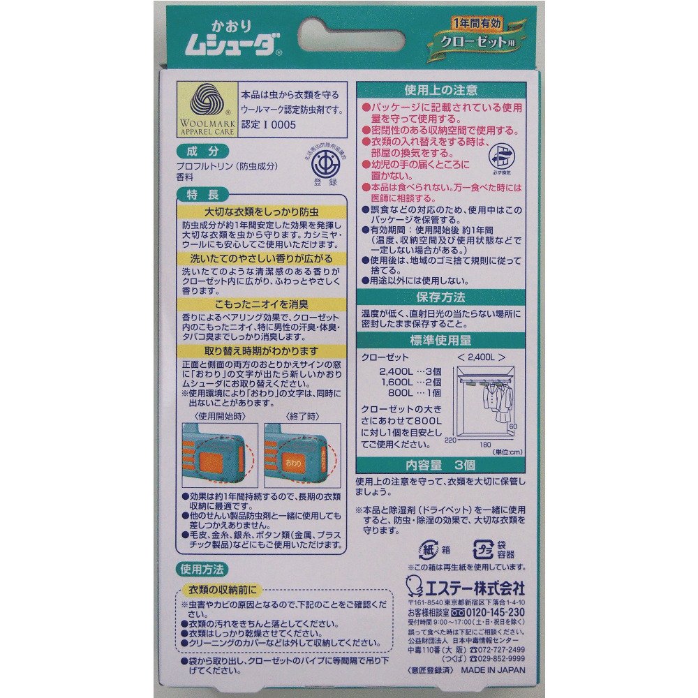 It is an insect repellent for closet. Three pieces with a validity period of 1 year are entered. It is a specification that uses 3 pieces in a space of 2400 liters. In brief, if the closet is 1 in width, use 3 pieces, if the width is 2 length, use 1 piece. (It is about 180 cm in width, about the same width as standard closing and sweeping windows.) If it is a folding double-closet closet, there are many things in between, so you can use it for 1 year with this product. Insecticide is a shape with hanging hang in a rectangle of about 17 cm in width, 4.5 cm in height and 1.2 cm in thickness. Since the vertical direction is short and it hardly interferes with hangers, even a full closet will fit. The manner of feeling smell is a part with individual differences so I can not declare it unconditionally but I feel that it smells a bit even if I close the closet because it has a scent. As for the effect naturally it can not be said quickly how to say, but I believe that "musheda" can be expected to be sufficient effect as it is used from before.