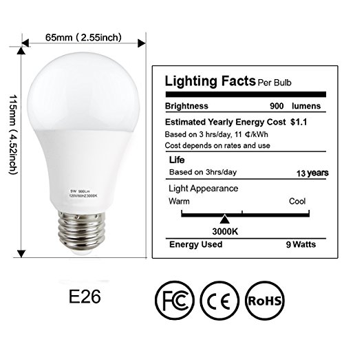 - ★ SAVE 85% ENERGY & MONEY: Equivalent to traditional 60 watt incandescent bulb, using only 9 watt, you will only spend about $1.1 per year in energy costs