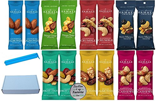 -. Feature : This Variety pack of Sahale Snacks includes: 2 Packs Each of: Cashews with Pomegranate & Vanilla / Almonds with Cranberries, Honeys & Sea Salt / Classic Fruit & Nut Blends / Berry Macaroon Almond Mix / Raspberry Crumble Cashew Mix / Mango Tango Almond Mix / California Almond in a gift box.. Also includes 2" Bag Clip and bonus magnet (Magnet and Gift Box Made Exclusively For Midwest Gifts N More) / This will make a great gift for yourself, your friends or family. / Make sure if this is a gift to request a free gift tag during check out. / Smaller bags of Sahale Snacks so you can throw one in your purse or car to take on the go! / Delicious right out of the bag, in your favorite recipes, or for entertaining. Perfect as a salad topper or recipe changer - Certified Gluten Free, Kosher, Non GMO, No Trans Fat