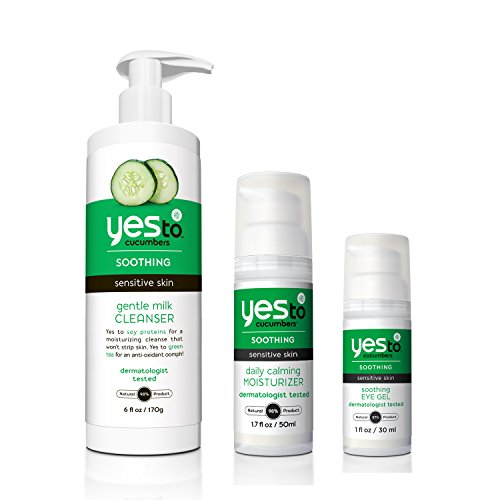 Get soft, smooth and soothed skin in just 3 simple steps and at a 25% savings to the Suggested Retail Price! This daily regimen naturally works to calm sensitive skin without over-drying. Step 1: Cleanse with the Yes To Cucumbers Gentle Milk Cleanser. This cleanser combines soy proteins, for a moisturizing cleanse that won’t strip skin, and green tea for an antioxidant dose of softness. Get ready to reveal your soft, healthy, glowing complexion to the world! WINNER of Allure Best of Beauty 2012. This product is 98% Natural, Petroleum free, SLS free, Paraben free, and Cruelty-free. To use, apply to face with warm water. Rinse, dry, be on your merry way! You'll be turning others green with envy from that gorgeous glow emanating from your sensitive skin! Step 2: Moisturize with the Yes To Cucumbers Daily Calming Moisturizer. This moisturizer will delight your skin with an extra dose of proteins and nutrients to purify and regenerate your complexion – while enhancing its natural healthy glow with gentle, fast-absorbing hydration. Go on, get out there show off that wonderful gleam and paint the town. Green! This product is 99.6% Natural, Petroleum free, SLS free, Paraben free, and Cruelty-free. To use, apply to your clean, beautiful face on a daily basis. Massage gently into your skin until lotion is absorbed. Step 3: Treat eye area with the Yes To Cucumbers Soothing Eye Gel. This eye gel naturally reduces puffiness, brightens dark circles, and tightens and cools your skin, leaving you bright-eyed, bushy-tailed and ready to take on the world! This product is 99% Natural, Petroleum free, SLS free, Paraben free, and Cruelty-free. To use, gently dab a bit of gel around your eye and smooth into skin. You'll feel the calming, cooling difference, immediately! Say yes to the Cucumbers Face Kit and yes to Sensitive Skin!Feature