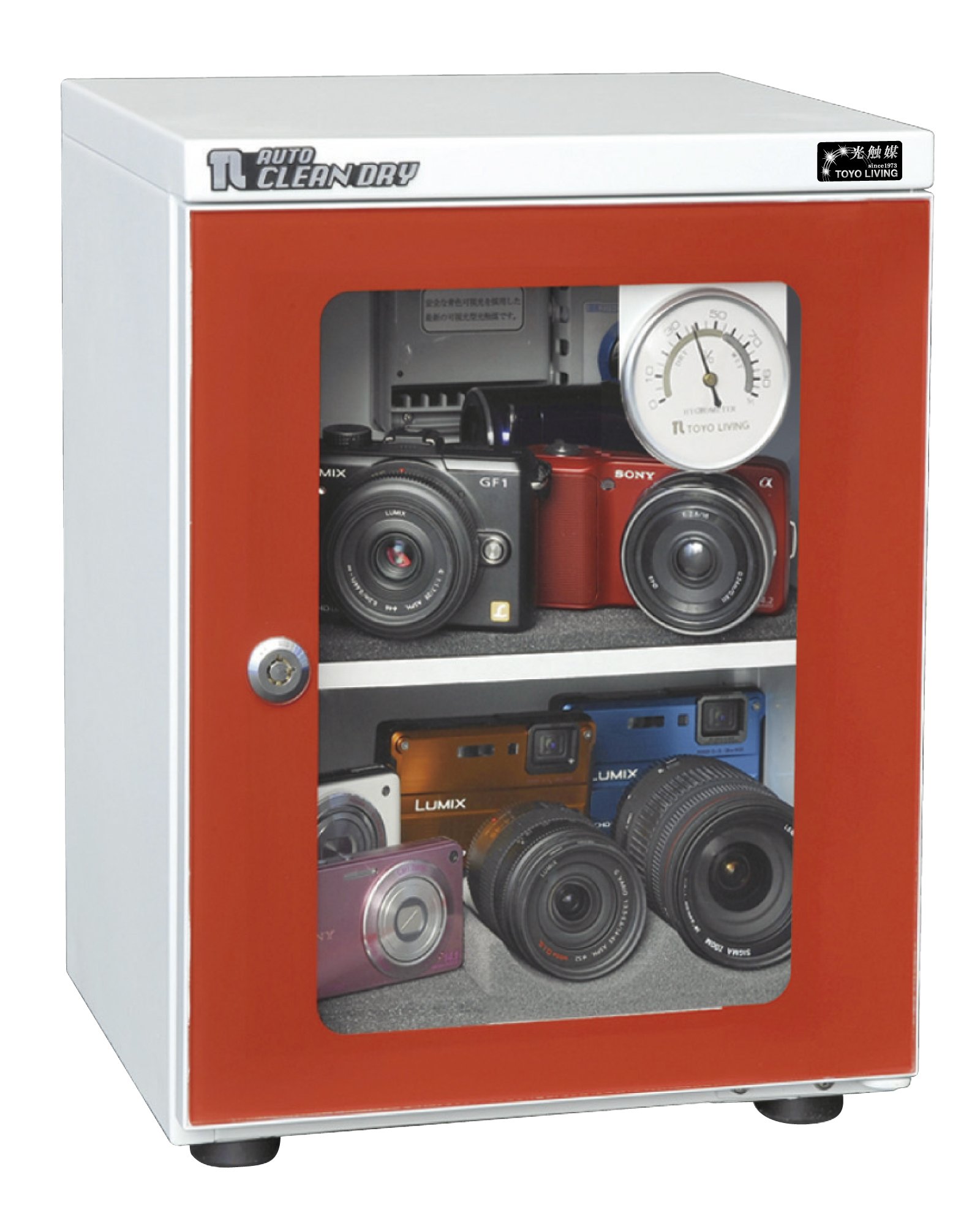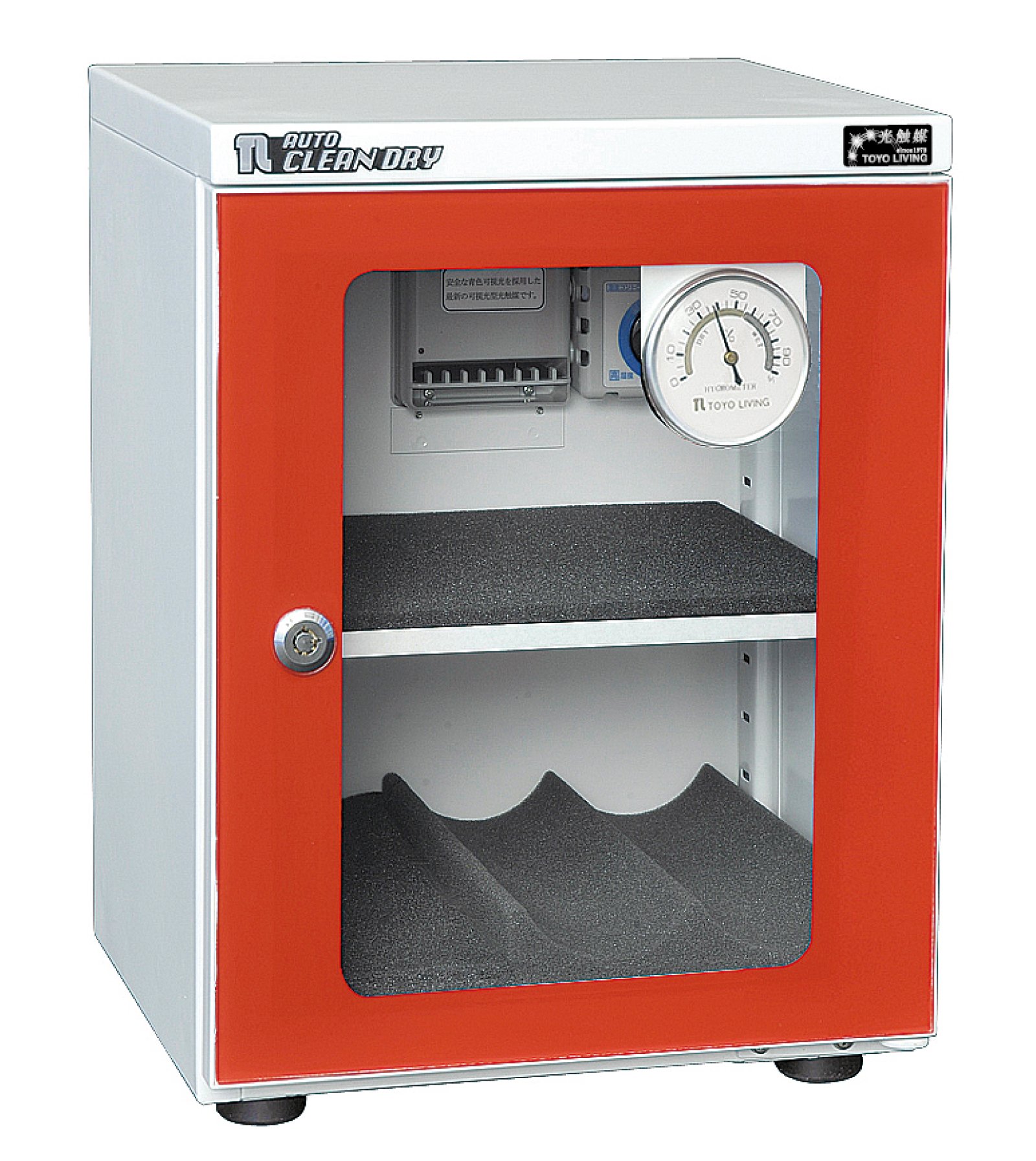 The built-in electronic unit made in Japan has a photocatalytic clean function of the light source inside, it can arbitrarily set 30% ~ 50% humidity inside the cabinet, maintenance free and stable dehumidification to prevent deterioration of lens mold and electronic parts