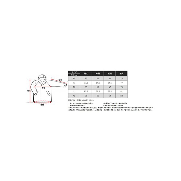 [소매 길이]: XS:75cm, S:77cm, M:79cm, L:81cm, XL:83cm ※수첨부(부) 위치에서 소매끝까지