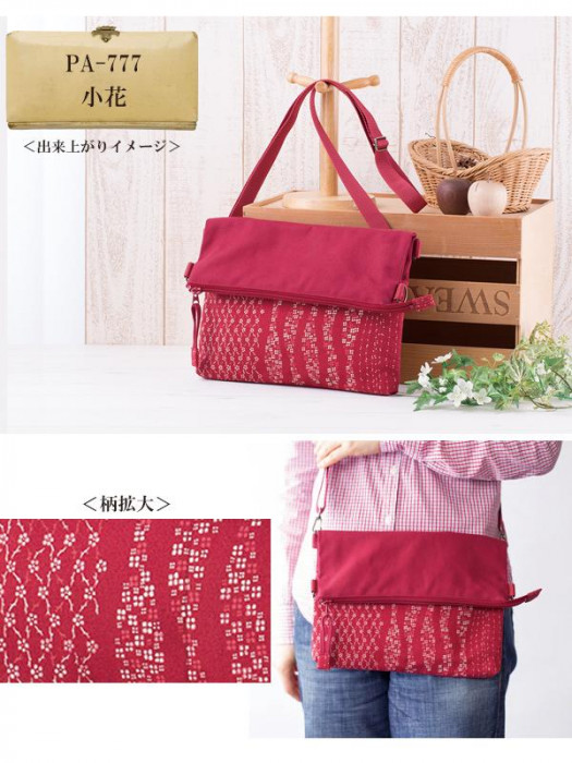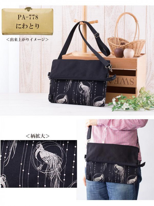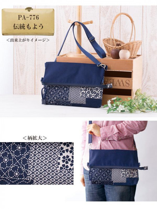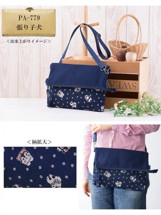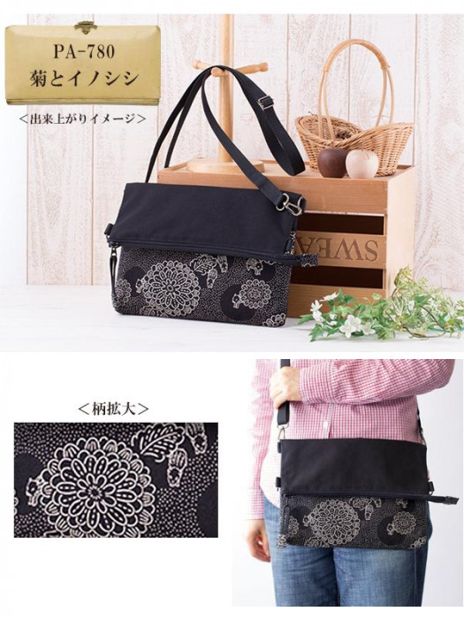 | セット内容 | 表布(2種)、裏布(1種)、接着芯(1種)、ファスナー(1本)、平テープ(本体用1本、肩紐用1本)、Dカン(4個)、送りカン(1個)、ナスカン(2個)、作り方説明書、実物大型紙 |