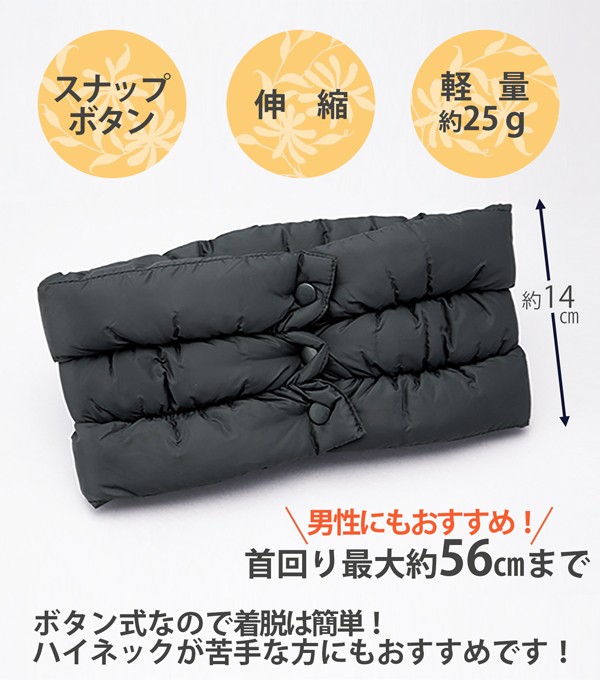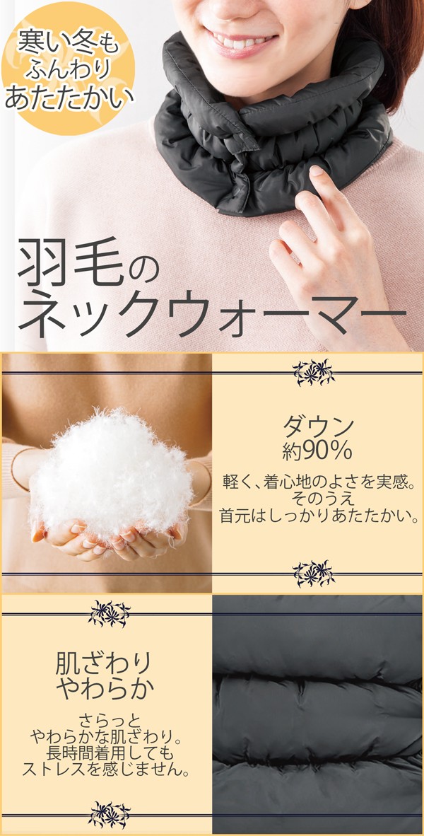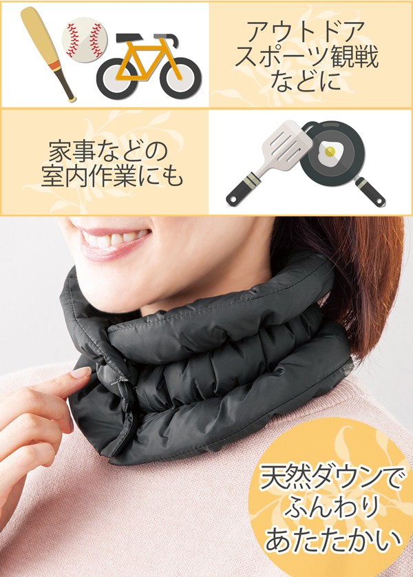 | 天然ダウンでふんわりあたたかい羽毛のネックウォーマー。重さ約25gと軽いのに、天然ダウン約90%で首元はしっかりあたたかい。そのうえ、肌ざわりはさらっとやわらかで、長時間着用していてもストレスを感じません。また、カバンに入れてもかさばらないため、通勤や通学などの普段使いはもちろん、アウトドアやスポーツ観戦などにも最適です。そして、家事などの室内作業にもおすすめです。 |