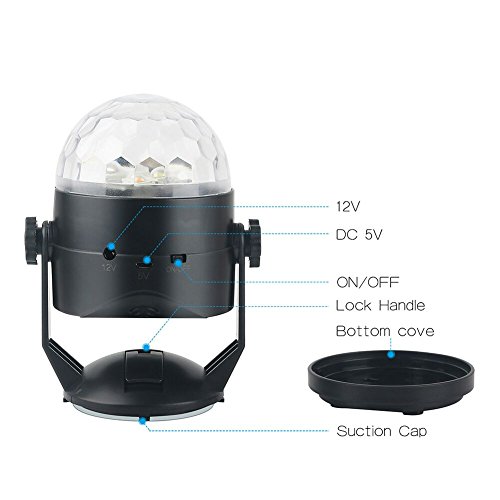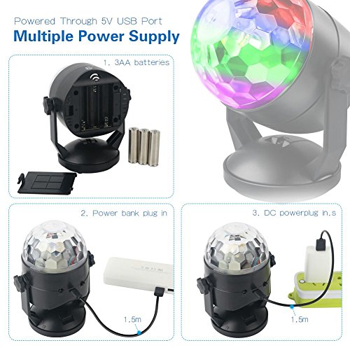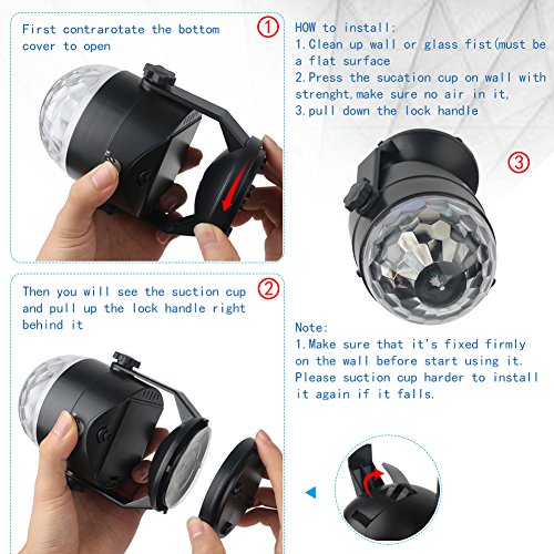 - ★【3 Kinds of Use Way】➽2 kinds of power: battery-powered / USB plug, 3 kinds of use: 1, the base has four holes, can be easily installed on the ceiling 2, can be placed on the table or on the floor 3, open the base buckle, find the sucker, In any smooth place, the 5Wdisco party lights are more bright