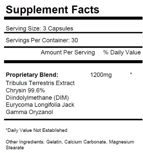 -. Feature : 1200mg Blend per 3 capsules. Contains: Tribulus Terrestris Extract, Chrysin 99.6%, Diindolylmethane DIM, Eurycoma Longifolia Jack, and Gamma Oryzanol / This listing is for 2 bottles. Each bottle contains 90 capsules per bottle for a total of 180 capsules.