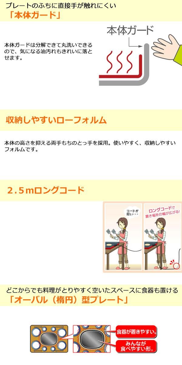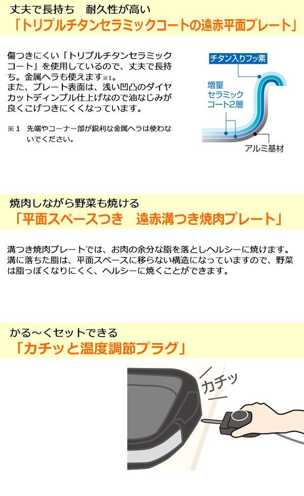 トリプルチタンセラミックコートの「遠赤平面プレート」ですので、耐久性が高く丈夫で長持ち!!それに加え、焼肉しながら野菜も焼ける平面スペースがついた「遠赤溝つき焼肉プレート」もセットになっています。また、電源コードは2.5mのロングコードです。 |