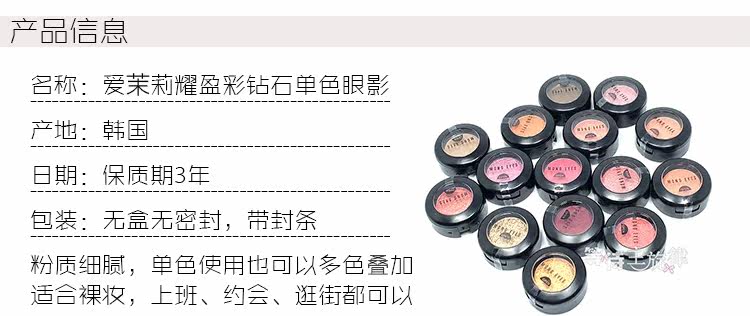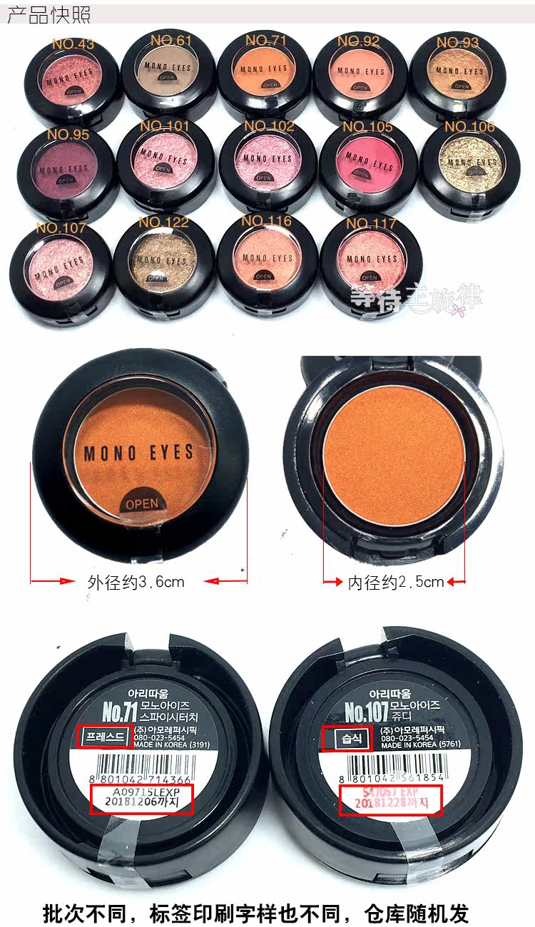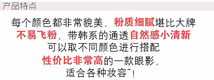 (1.)mono系列眼影适合裸妆,日常上班、约会、逛街都可以搭配使用哦(2.)多种裸妆色彩可选,粉质细腻,无飞粉现象,多种矿物质粉做成的眼影,完全安全健康。