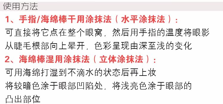 (3.)单色使用或者与其他颜色搭配使用,单色使用时,为了增加层次感,作为打底在整个眼窝处涂抹一遍,在双眼皮等重点部位再涂抹一次,以便加深颜色。