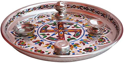 - Auspicious Pooja Thali in Stainless Steel Meenikari with Peacock Design 11 Inches in Diameter, Holy Decorated Worship Plate