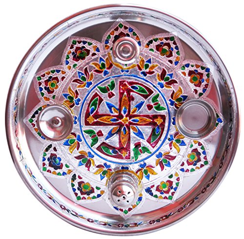 Auspicious Pooja Thali in Stainless Steel Meenikari with Sakia Design 11 Inches in Diameter, Holy Decorated Worship Plate