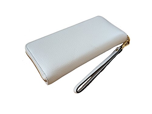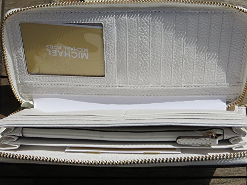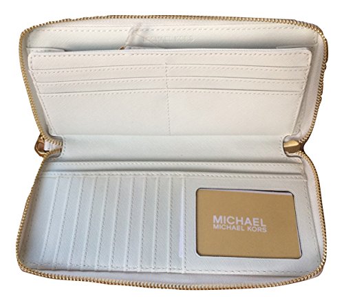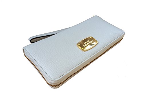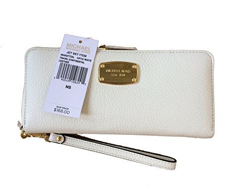 Product Description Spacious travel wallet wrapped in classic optic white tone pebbled leather with polished golden tone hardware. The front is accented with Michael Kors logo nameplate which has been updated for 2015 with an elevated profile and rounded corners. This zip around style wallet has a leather and signature fabric interior that features (16) card slots, a clear ID slot, (6) full length bill compartments and a zippered coin compartment. It has a removable wristlet strap and measures approximately 8.25" (L) x 4" (H) x 1.25" (W). It has an MSRP of $168.00. 0