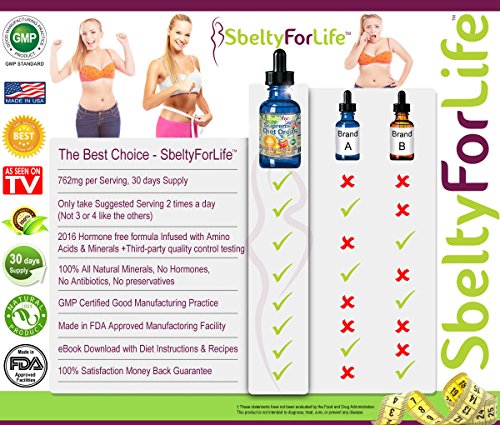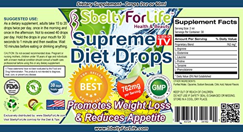 -. Binding : Health and Beauty -. Brand : SbeltyForLife -. EAN : 0743724341621 -. Feature : NEW AND IMPROVED ALL-NATURAL oral drops 762mg to boost your metabolism and signal that your stomach is full sooner. This induces thermogenesis, burning stored fat for energy to reduce your caloric intake and sculpt your body. / FREE DOWNLOADABLE EBOOK contains complete instructions for undertaking the Diet Drops weight loss plan, as well as 48 recipes and 15 weight loss tips to help you achieve your fitness goals. Like us on Facebook and Download your copy here: www.sbeltyforlife.com/vip / SAFE AND EFFECTIVE for Men and Women. Homeopathic blend of amino acids, vitamins and minerals provide a 30-day weight loss program. Cobalt blue bottle with eyedropper prevents degradation of contents. / FDA-APPROVED GMP-CERTIFIED FACILITIES guarantee product consistency through rigorous quality controls and third-party testing. Pharmaceutical-grade manufacturing ensures the highest potency per dose. / 30-DAY MONEY-BACK GUARANTEE ensures your satisfaction. If Diet Drops do not perform to your expectations we will promptly refund 100% of your purchase price. -. IsAdultProduct : 0 -. Label : SbeltyForLife -. LegalDisclaimer : These Statements have not been evaluated by the Food and Drug Administration. This product is not intended to diagnose, treat, cure or prevent any disease. Actual product packaging and materials may contain more and different information than what is shown on our website. We recommend that you do not rely solely on the information presented and that you always read labels, warnings, and directions before using or consuming a product. -. Manufacturer : SbeltyForLife -. PackageQuantity : 1 -. ProductGroup : Health and Beauty -. ProductTypeName : HEALTH_PERSONAL_CARE -. Publisher : SbeltyForLife -. Studio : SbeltyForLife -. Title : SbeltyForLife® DIET DROPS WEIGHT LOSS SUPPLEMENT 2oz 60ml 762mg 30 Days Fat Burner Diet Supplement Appetite Suppressant for Men and Women FREE eBook with Diet Instructions Tips & Recipes Removes Belly Fat for a Lean Body All Natural Vitamin Mineral -. UPC : 743724341621