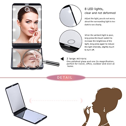 MIRROR WITH LED LIGHTS:Built-in 8 LED lights brightness adjustable it is bright and clear to makeup, which allows you finish a exquisite makeup,Convenient to use even in darkness