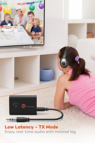MAKE IT TWO: Upgraded 2-in-1 Bluetooth V4.1 transmitter can be paired with two Bluetooth receivers (like headphones + speakers) simultaneously. Note: aptX Low Latency does NOT support Dual Link mode.