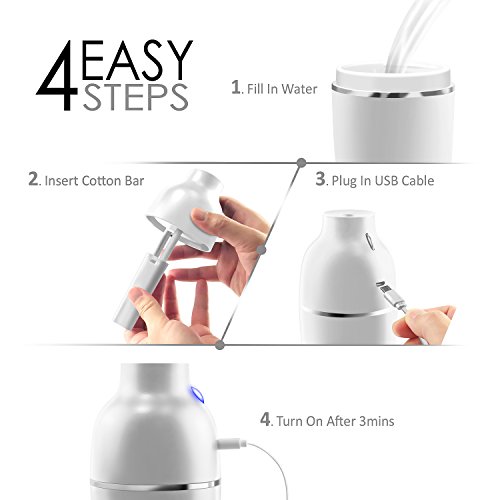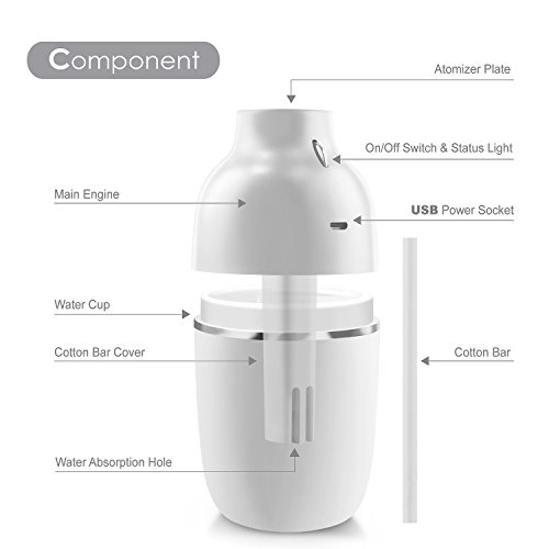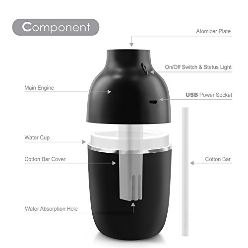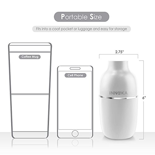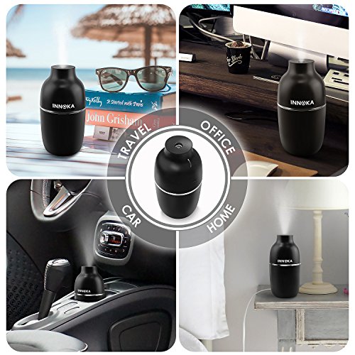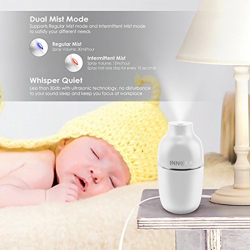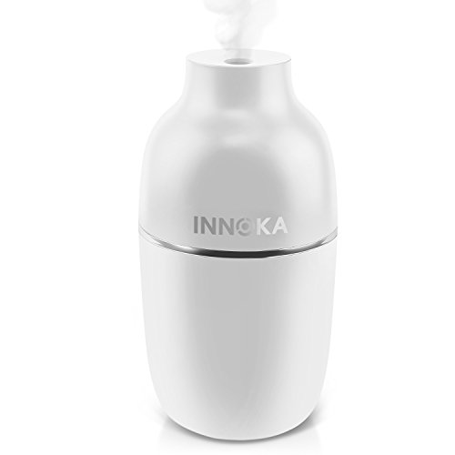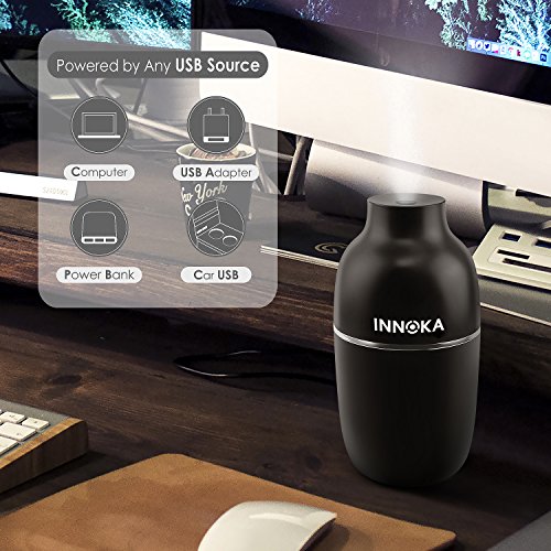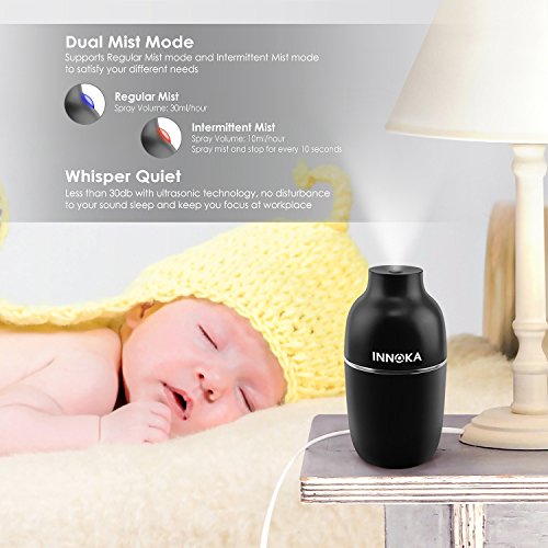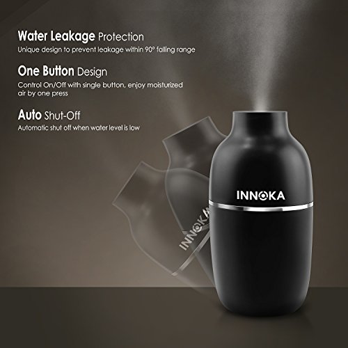 -. Feature : Are you suffering from irritation of skin, teary eyes or any problems in the airway that caused by dry air? INNOKA Ultrasonic Mini Humidifier is the best solution to combat dry room air and increase the amount of moisture in the air; benefit to your sinus health and relieve allergies, dryness of skin & throat, nose bleed and flu symp. Cool mist humidifier operated without hot water can prevent hot water accidents to keep your children or pets safe as well as cool off your surrounding air / Dual Mist Mode: Intermittent mist mode with LED light indicator to show the spray volume absolutely clear; Regular Mist Mode (blue light), Intermittent Mist Mode (red light) - humidifier will spray mist in 10 seconds interval. Portable & Lightweight: Ideal for home/bedroom/office/car/travel use; enjoy the health benefits while you are on the go and cannot carry your normal sized humidifier. Sleek and delicate design to fit in your home décor / Water Leakage Protection: Unique design to prevent water leakage within 90 degrees falling range, perfect to use in car or room. Silent in use: Ultrasonic humidifier uses high-frequency ultrasonic vibrations to evaporate the water which makes it significantly quiet; Less than 30db which is perfect companion when you are sleeping or working long hours in front of your laptop/PC / Auto Shut Off: Features automatic shut off when water level drop below the standard level line to protect the humidifier from damage and ensure your safety. One Button Design: Easy to control On/Off/Mist Mode with single button / Works with any USB Power Source: laptop/PC, power bank, USB AC adapter; convenient to use in workplace or on the go. Comes with free extra cotton bar as replacement. Color: Black. Container Volume: 180ml. Spray Volume: 30ml/hour (Continuous Mist mode); 10ml/hour (Intermittent Mist mode). Dimension: 2.75 x 6 inches. Note: DO NOT use hot water/high purified & distilled water/aroma; Do NOT fill water through atomizer plate directly or touch the plate when the item is in use