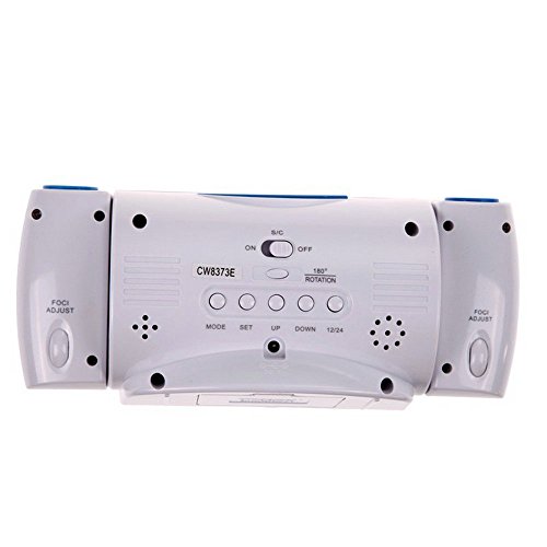 Studio : QBY Publisher : QBY Binding : Kitchen Product Description Features: Clap the palm lightly around the product or tap the desk where putting the product, or touch any position of the product,the back light and the projection light of the products will be turned on Activation of LCD-back light and projection for 5 seconds by pressing snooze Wake-up by buzzer, snooze function Dual projector, one for time, one for temprature and projecting angle and focus can be adjusted Specifications: Product name: Digital alarm clock Material: ABS LED Color: white Batteries: 3xAAA-R03(not included) Unit size: 19.2x6.0x8.5(cm) Package including: 1 x Digital alarm clock 0