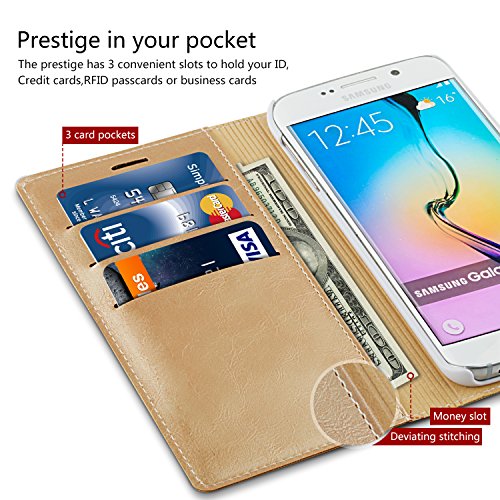S6 Edge Case, Galaxy S6 Edge Case, Vakoo Flip Premium Leather Hard Back Case for Samsung Galaxy S6 Edge with 3 Card Slots and 1 Cash Pocket - Gold