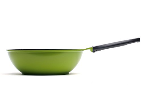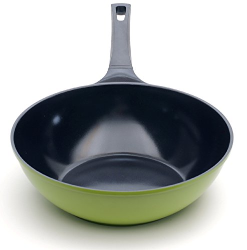 Utilizing pure ceramic as a coating, the Green Earth Wok by Ozeri is one of the world's first frying woks to achieve non-stick perfection while remaining absolutely free of PTFE, PFOA and other harmful chemicals. Conventional cookware and other ceramic cookware brands achieve their non-stick performance through a coating of PTFE (PolyTetraFluoroEthylene), a synthetic substance that has waxy properties. At very high temperatures, PTFE begins to decompose and release fumes which are documented to be lethal to birds and small pets, and which can be harmful to humans. In addition, traditional cookware incorporating PTFE is often manufactured with the aid of PFOA (PerFluoroOctanoic Acid), which the EPA has classified as a 'persistent pollutant of the environment'. With the Green Earth Wok's ecozeri technology, even under high temperatures, such harmful toxic fumes are never released into the environment. This is because the Green Earth Wok by Ozeri utilizes a 100% ceramic coating inspired by nature. The Green Earth Wok's ceramic coating is completely free of PTFE and PFOA. In addition to being eco-friendly and ultra-safe, the Green Earth Wok's ceramic coating is far more durable and scratch-resistant than other non-stick surfaces. With better non-stick properties, the Green Earth Wok by Ozeri allows you to saute, fry, bake, boil and braise with as little as half the amount of oil normally used, and it makes cleaning a breeze. The Green Earth Wok by Ozeri is made of the highest quality die-cast aluminum that allows for even cooking and fantastic browning without the risk of hot spots. It boasts a magnetized bottom for rapid heat transfer on induction stoves, and a heat resistant Bakelight handle. Your satisfaction is guaranteed.Feature