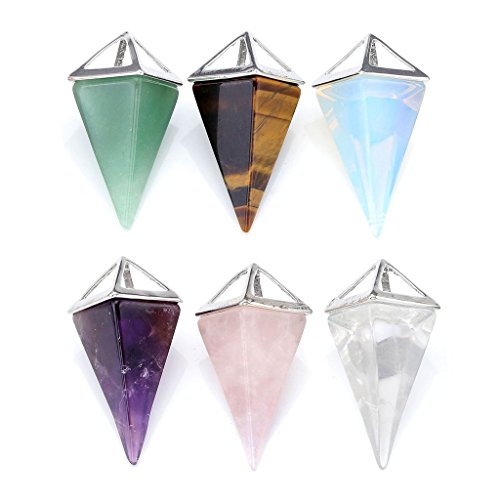 Top Plaza Quadrangular Pyramid Cone Silver Hollow Case Reiki Healing Crystal Natural Stone Pendulum Pendant Necklace(Set of 6)