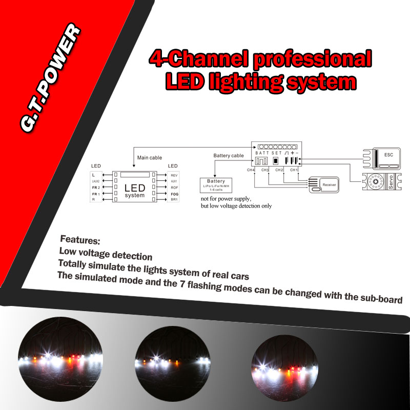 G.T.POWER 4 Channel Professional LED Lighting System for RC Trucks. The flashing mode, simulated turn signal , backward light can bring you real driving experience. It is easy to assemble and operate, it is the best choice of most of the RC amateurs.