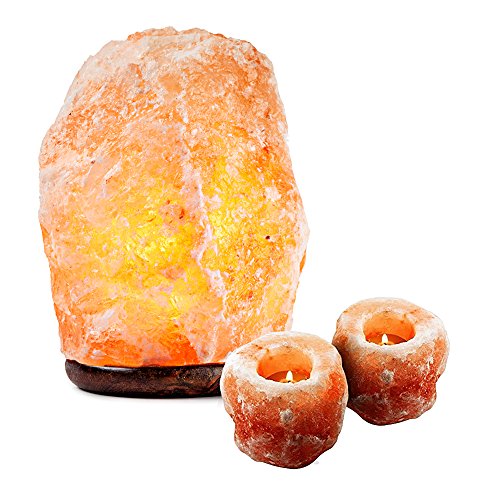 Hemingweigh Himalayan Glow Hand Carved Natural Crystal Himalayan Salt Lamp With Genuine Wood Base, Bulb And On and Off Switch 6 to 8 Inch, 6 to 7 lbs. and 2 Piece Natural Himalayan Salt Candle Holder