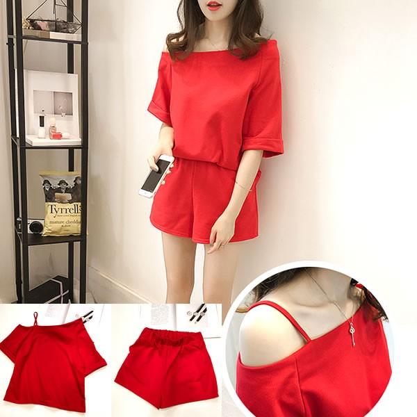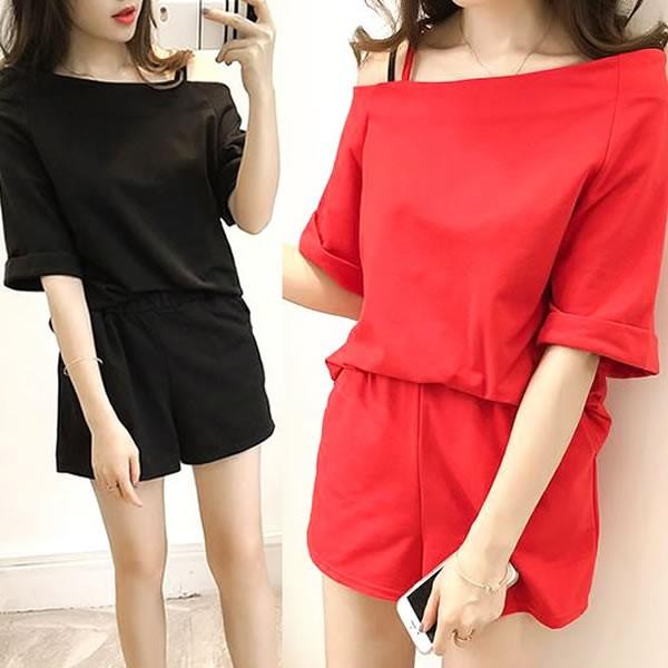 | 商品詳細 | <SIZE> Mサイズ トップス 丈:55cm バスト:47cm 袖丈:27cm ショートパンツ 丈:34cm ウエスト:30~38cm(ゴム) ヒップ:47cm 太もも幅:32cm 平置き採寸 カラー black ブラック red レッド 袖折り返しデザインのオフショルダートップスと ショートパンツの上下セットアップ。 |