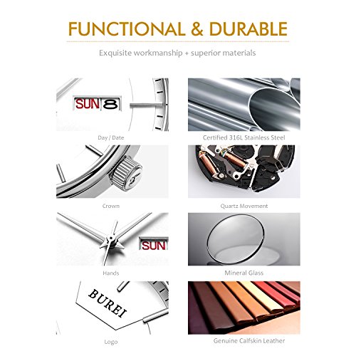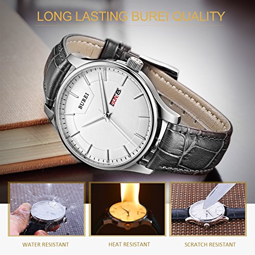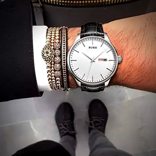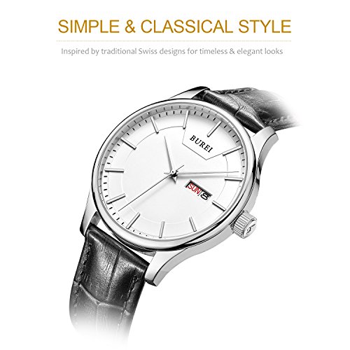 -. Binding : Watch -. Brand : BUREI -. Color : black and white -. Department : Mens -. EAN : 0712411207038 -. Feature : Polished silver-tone watch in stainless steel featuring white dial with bilingual date in both English and Spanish / Croco-embossed calfskin leather strap with buckle closure / Protective mineral crystal dial window / Japanese quartz movement / Water resistant to 30 m (99 ft) -. Label : BUREI -. Manufacturer : BUREI -. Model : SM-13001-P01AY -. MPN : SM-13001-P01AY -. PackageQuantity : 1 -. PartNumber : SM-13001-P01AY -. ProductGroup : Watch -. ProductTypeName : WATCH -. Publisher : BUREI -. Studio : BUREI -. Title : BUREI® Men's SM-13001-P01AY Day and Date Black Calfskin Leather Watch with White Dial -. UPC : 712411207038