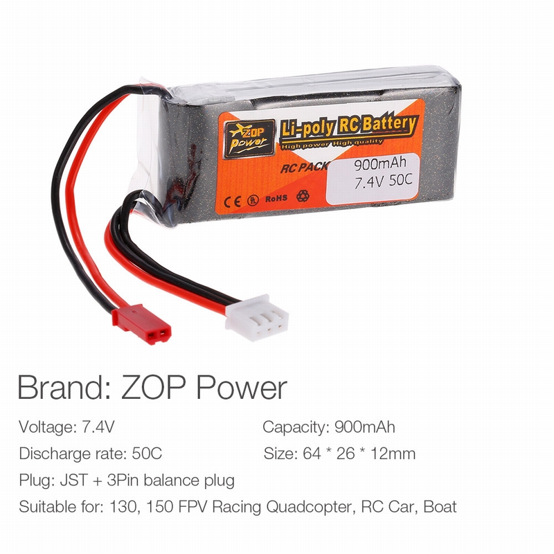ZOP Power 2S 7.4V 900mAh 50C li-po battery with JST plug for RC fans. This battery is suitable for 130 150 wheelbase RC FPV racing drone and other RC car and boat with JST plug. Perfect choice for you to enjoy more flying fun.