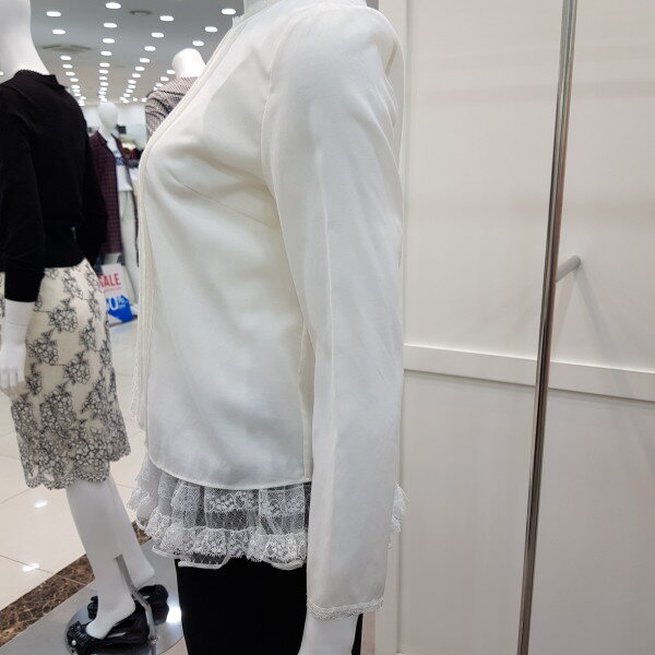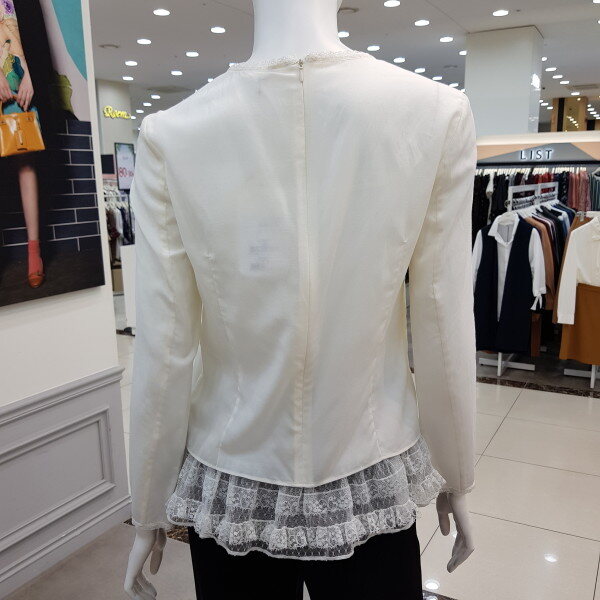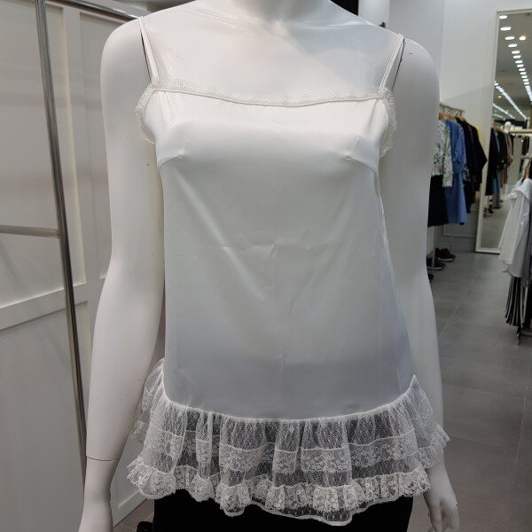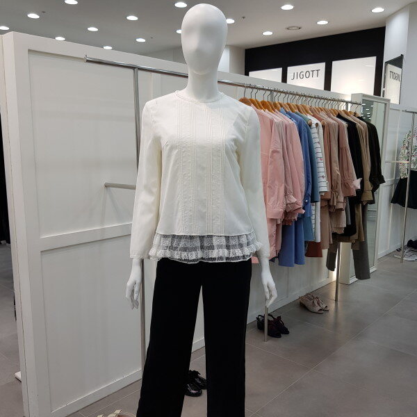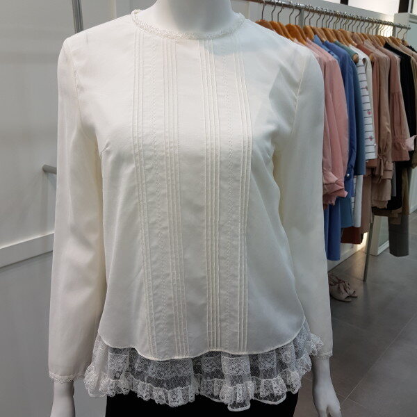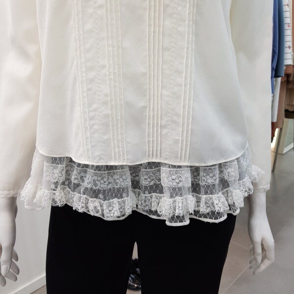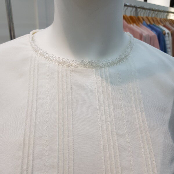 밑단의 캉캉 프리리이 달린슬립과 세트로 연출하는 스타일. 앞판의 핀턱과 자수 디테일로 고급스러움을 더한 블라우스