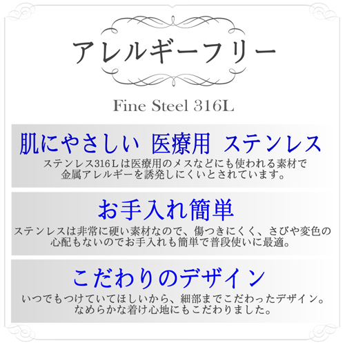 ●アレルギーを誘発しにくい、最高位の医療用ステンレス316Lに、天然ダイヤモンドをあしらった飽きのこないデザイン。