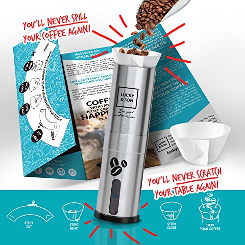 EASY FILLING, NO SPILLING SYSTEM designed with passion by Lucky & Son; the innovative Funnel fits on the hand burr grinder and will help you pour your coffee inside the bean grinder, keeping your kitchen counter tidy and your coffee beans where they need to be, in your grinder