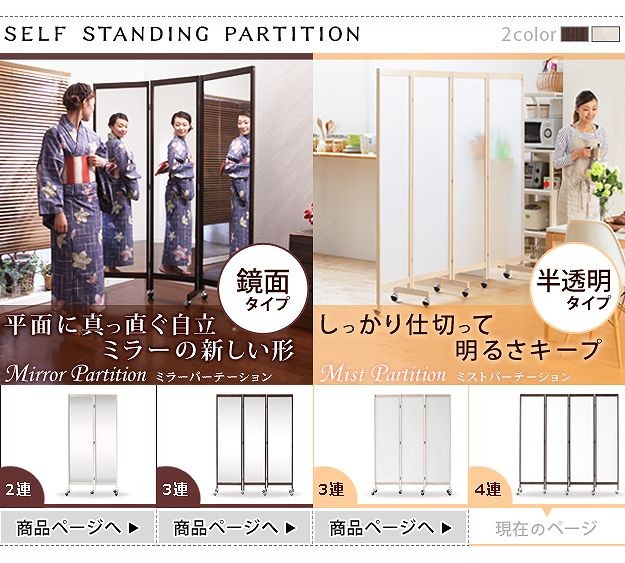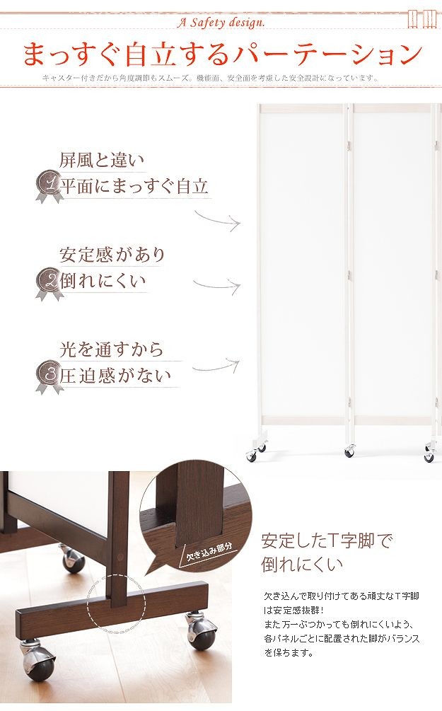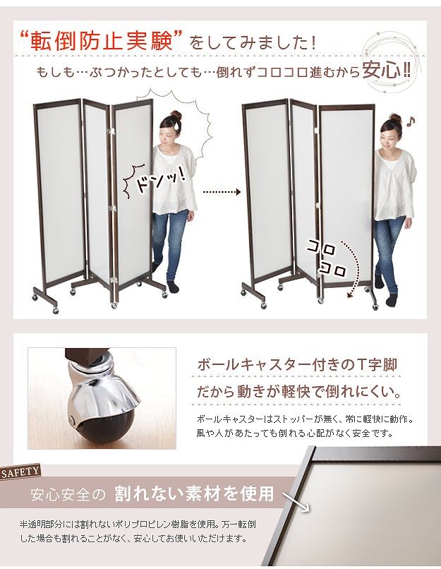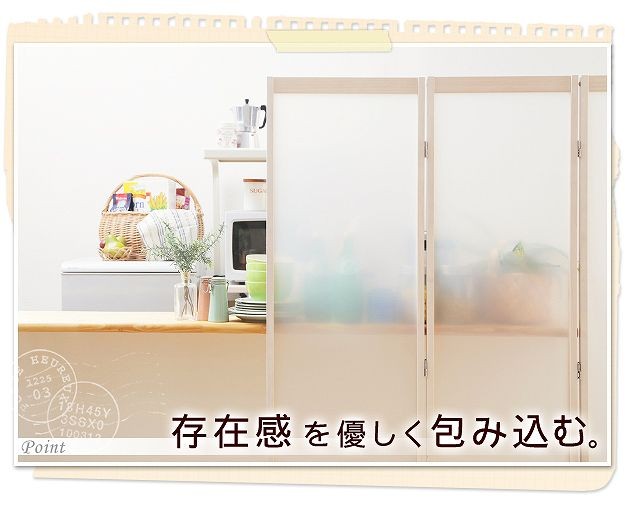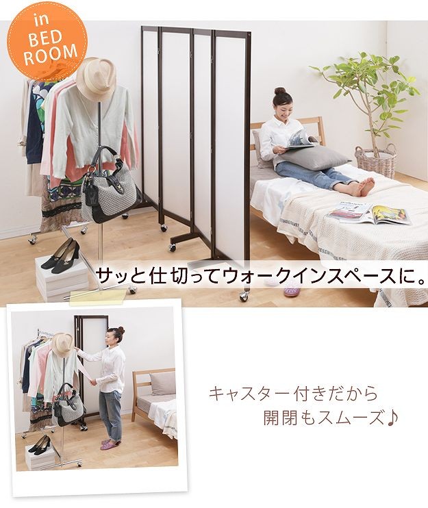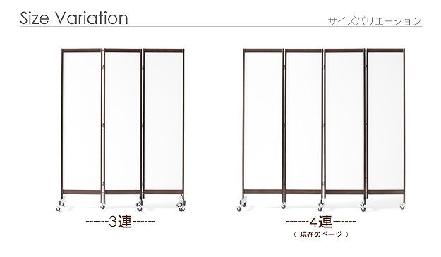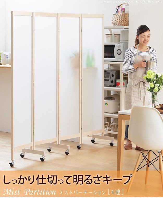 キャスター付きのパーテーション4連。キッチン・リビングなどお部屋の間仕切り・目隠しに☆光を通す半透明パネルで圧迫感が少ないのが魅力。明るさを保ちつつ視線を遮ってくれます。折りたたみ時にキャスターが重ならない設計なのでぴったりたためて便利。スッキリ収納できます。