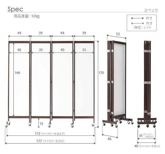 サイズ(cm):幅177x奥行40x高さ170cm(キャスター含む)・約12kg
