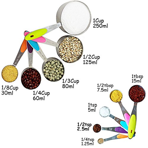 - 5 MEASURING CUPS(1 cup, 1/2 cup, 1/3 cup, 1/4 cup, 1/8 cup,) 5 MEASURING SPOONS (1 tablespoon, 1/2 tablespoon, 1 teaspoon, 1/2 teaspoon, 1/4 teaspoon.),1 FREE GIFT AND 2 DETACHABLE RINGS