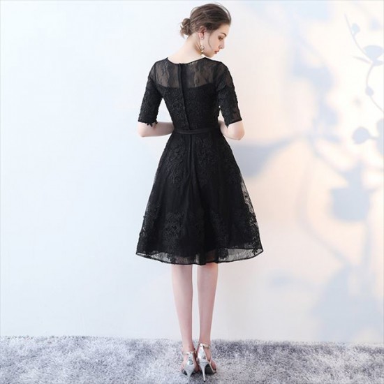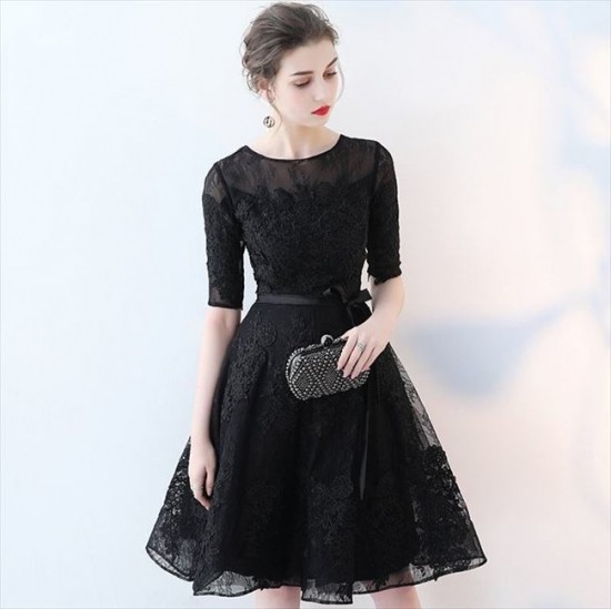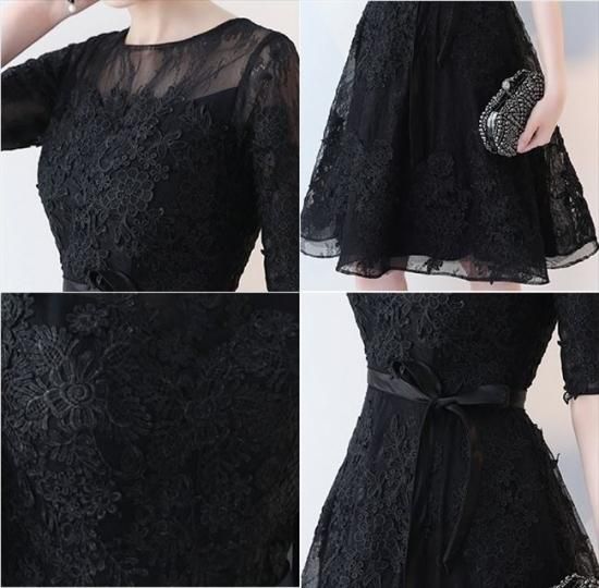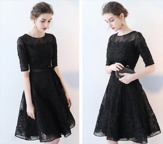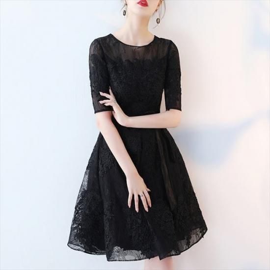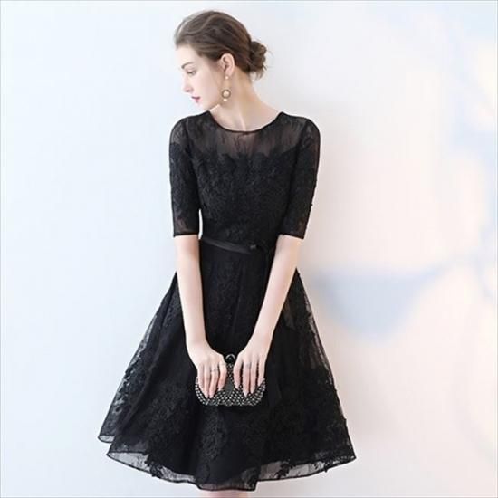 パーティードレス ミニ丈 ワンピース 五分袖 レース 透け感 ブラック ウエストリボン 上品 大人 お呼ばれ drgz2712