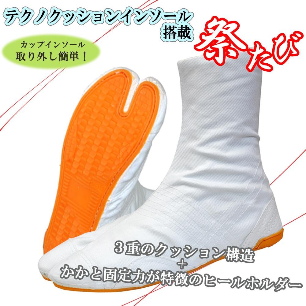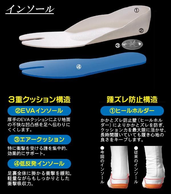 | 衝撃吸収力とかかと固定力が特長の3重テクノクッションインソール搭載!!内蔵インソールだから外観は縫付薄底のシンプルな祭たびのまま!!かかとズレ防止構造なので、走り・飛び跳ねに強く地車祭や踊り祭等の激しい祭りに好適です。 |