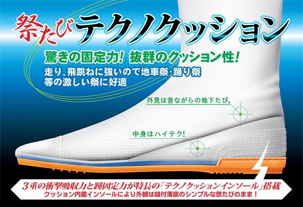 衝撃吸収力とかかと固定力が特長の3重テクノクッションインソール搭載!!内蔵インソールだから外観は縫付薄底のシンプルな祭たびのまま!!かかとズレ防止構造なので、走り・飛び跳ねに強く地車祭や踊り祭等の激しい祭りに好適です。 |
