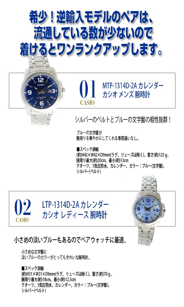 | 仕様 | ステンレス(ケース)、ステンレス(ベルト) メンズ:クオーツ、5気圧防水、カレンダー(日付)、カラー:ブルー(文字盤)、シルバー(ベルト) レディース:クオーツ、5気圧防水、カレンダー(日付)、カラー:ブルー(文字盤)、シルバー(ベルト) 1年間 |