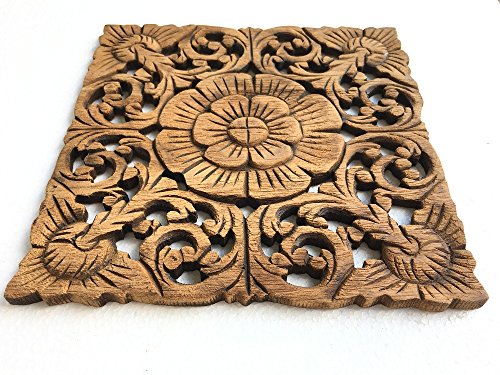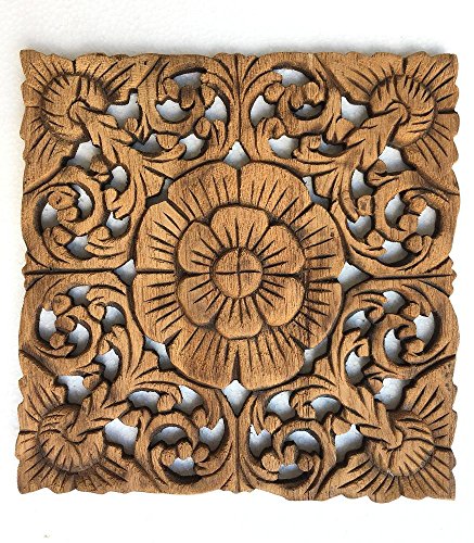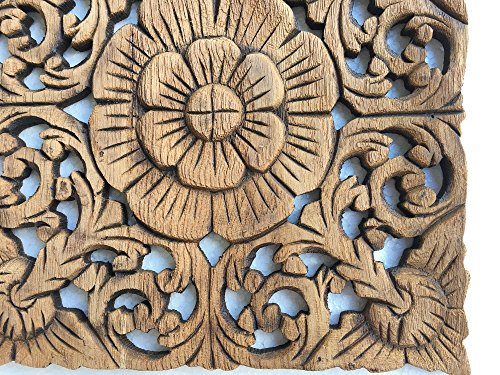 Wood Wall Art- Wood Plaque Oriental Carved Flower in Brown Finish, Thailand, By WASUWAN SHOP.