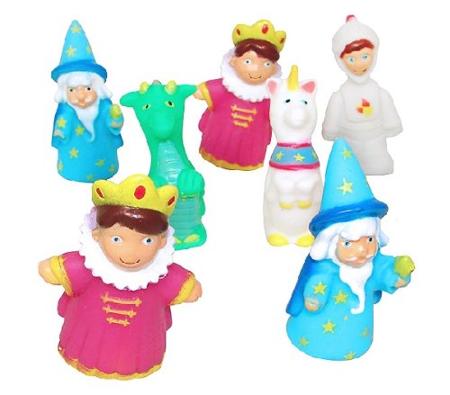 This set of 24 rubber finger puppets makes great party favors for birthday parties or kids classroom parties. Your guests will have a cute and fun party favor to take home. The perfect size for a cupcake topper, each measures approx 2"H. You'll receive an assortment of the 6 styles pictured: princess, knight, dragon, unicorn, frog prince, and wizard. Not recommended for children under age 3.Feature