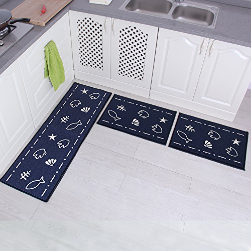Carvapet 3 Piece Non-Slip Kitchen Mat Rubber Backing Doormat Runner Rug Set, Fish Shell Design (Navy 15"x47"+15"x23")