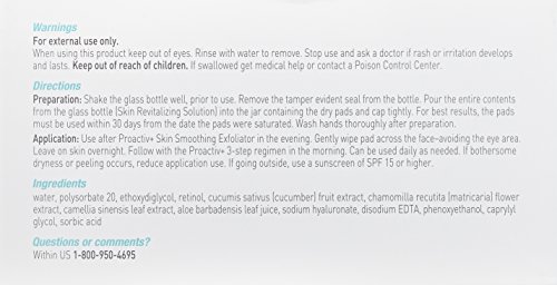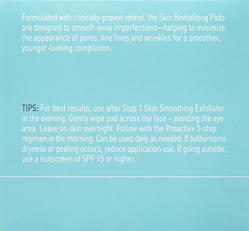 -. Binding : Health and Beauty -. Brand : Proactiv -. EAN : 0735786015459 -. Feature : Designed to remove oil and other impurities / Designed to help soften, smooth and even skin tone / Infused with botanical extracts such as green tea, chamomile, cucumber, aloe and witch hazel / Use regularly to help control oil and help minimize the appearance of pores / Dermatologist tested -. IsAdultProduct : 0 -. Label : Guthy Renker -. Manufacturer : Guthy Renker -. MPN : B00TI6TSHI -. NumberOfItems : 1 -. PackageQuantity : 1 -. PartNumber : B00TI6TSHI -. ProductGroup : Beauty -. ProductTypeName : BEAUTY -. PublicationDate : 2015-02-14 -. Publisher : Guthy Renker -. ReleaseDate : 2015-03-12 -. Studio : Guthy Renker -. Title : Proactiv+ Skin Revitalizing Pads, 90 Count -. UPC : 735786015459